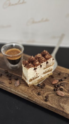 Ingrediente: făină, ouă grăsimi vegetale, zahăr, mascarpone, frișcă animală, arome, cafea naturala, fructe.