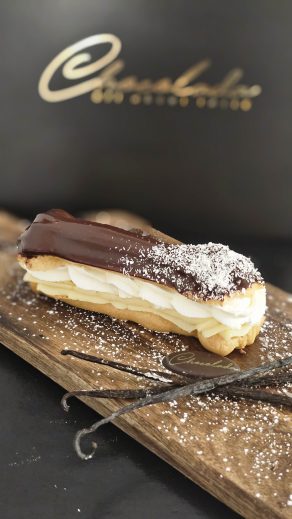 Ingrediente: făină, grăsimi vegetale, ouă zahăr, ciocolată, cremă vanilie, lapte, ciocolată neagră.