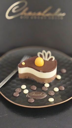 Ingrediente: făină, ouă zahăr, cacao, frișcă animală, cioc albă belgiană, ciocolată neagră belgiană, pralina alune, gelatină.