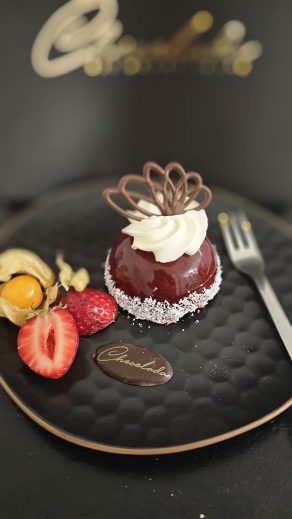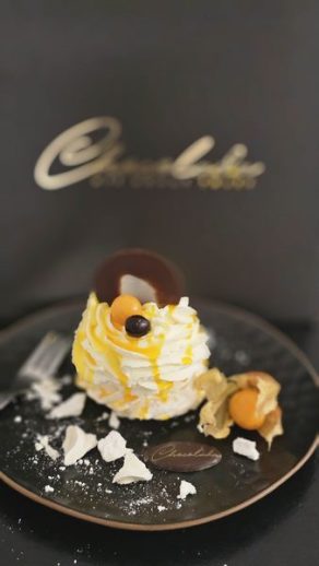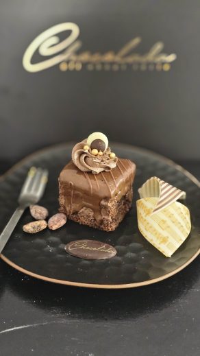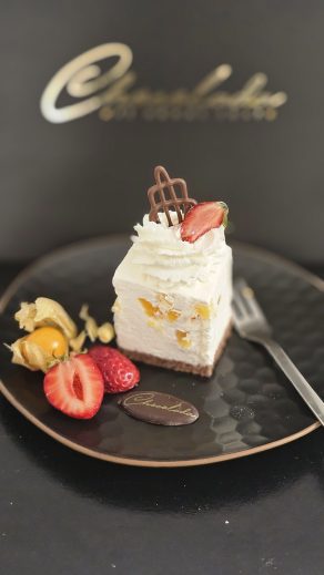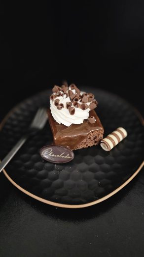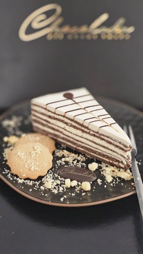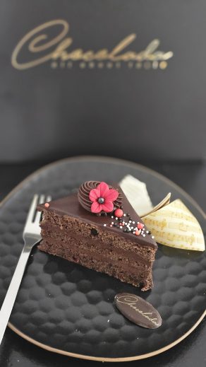 Ingrediente: făină, ouă zahăr, cacao, ciocolată neagră belgiană, frișcă animală, esențe.