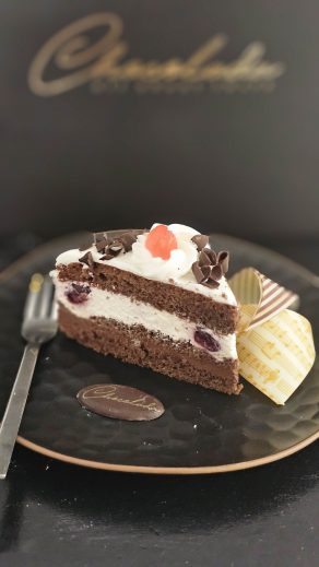 Ingrediente: făină, ouă zahăr, cacao, ciocolată neagră belgiană, frișcă animală, visine amarene, gelatină.