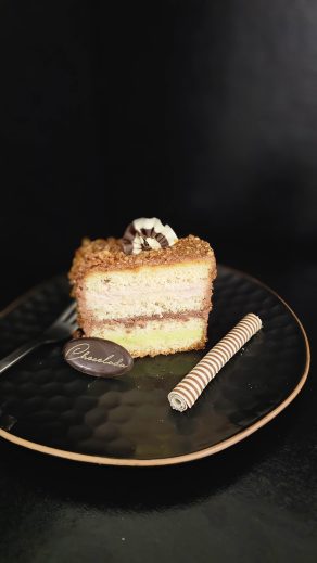 Ingrediente: făină, ouă zahăr, cacao, ciocolată caramel belgiană, frișcă animală, pralina de alune, gelatină.